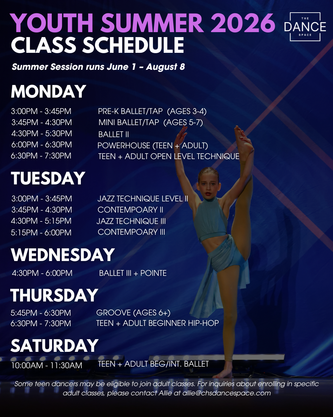 Classes are subject to change. THE DANCE SPACE follows the Charleston County school inclement weather policy. In the event of a weather cancellation, please check our Instagram for closings. We'll do our best to update you on any closings via the email provided at registration.